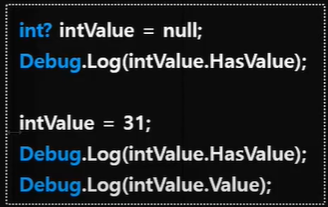 HasValue : 변수가 값을 가지고 있는지 가지고 있지 않은지 (true/false)