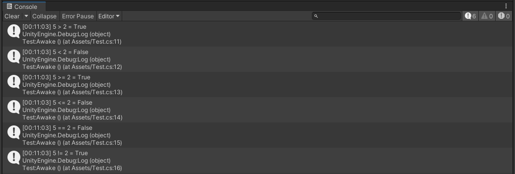 Debug.Log($"{x} >= {y} = {x >= y}");