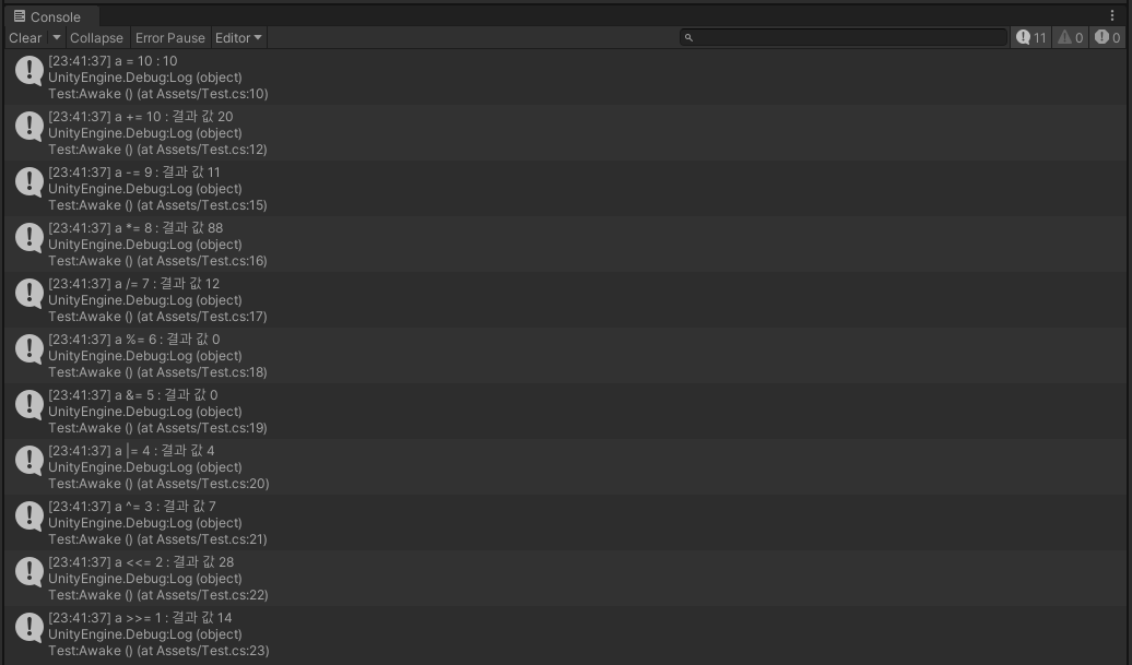 Debug.Log($"a -= 9 : 결과 값 {a -= 9}");