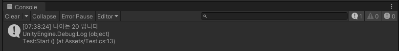 Debug.Log("나이는 20 입니다");