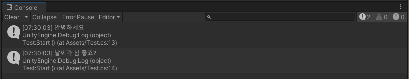 Debug.Log("안녕하세요");