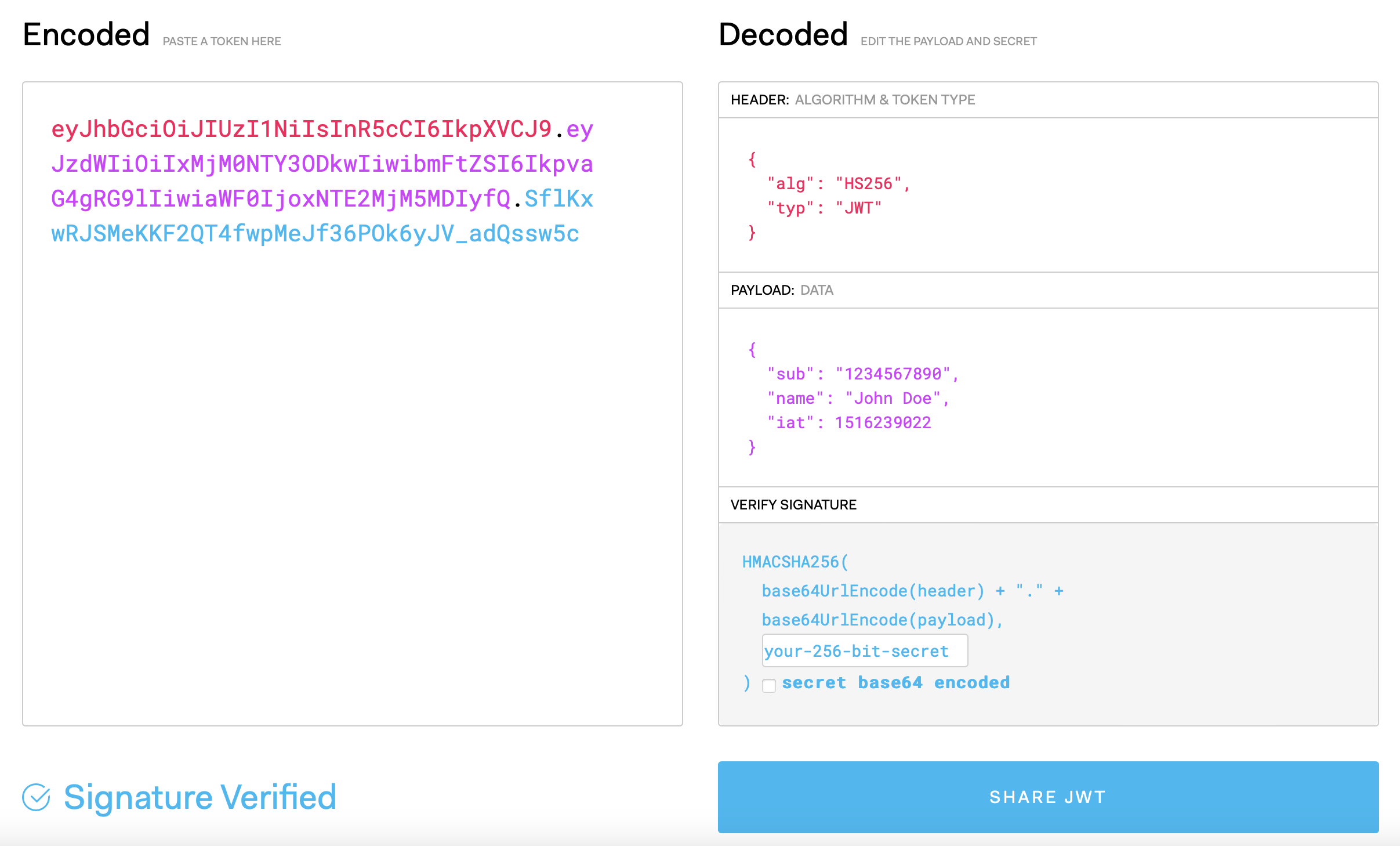 해당 페이지를 들어가보면 JWT를 생성, 인코딩/디코딩/서명을 테스트 해볼 수 있다.