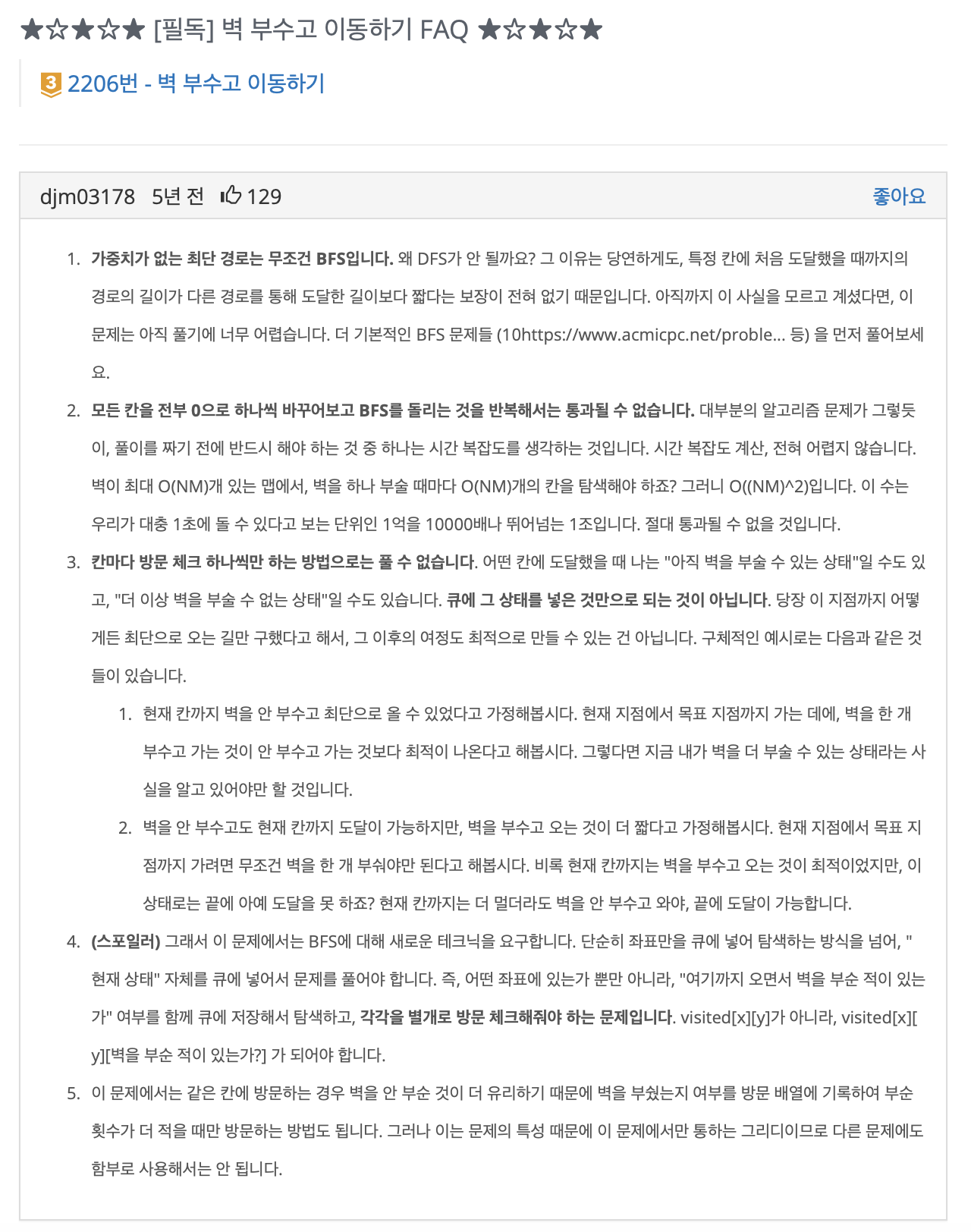 사실은 처음에는 모든 벽을 탐색하여 하나씩 0으로 바꾸고 bfs를 수행했을 때의 결과를 구하는 방식으로 구현을 했다.