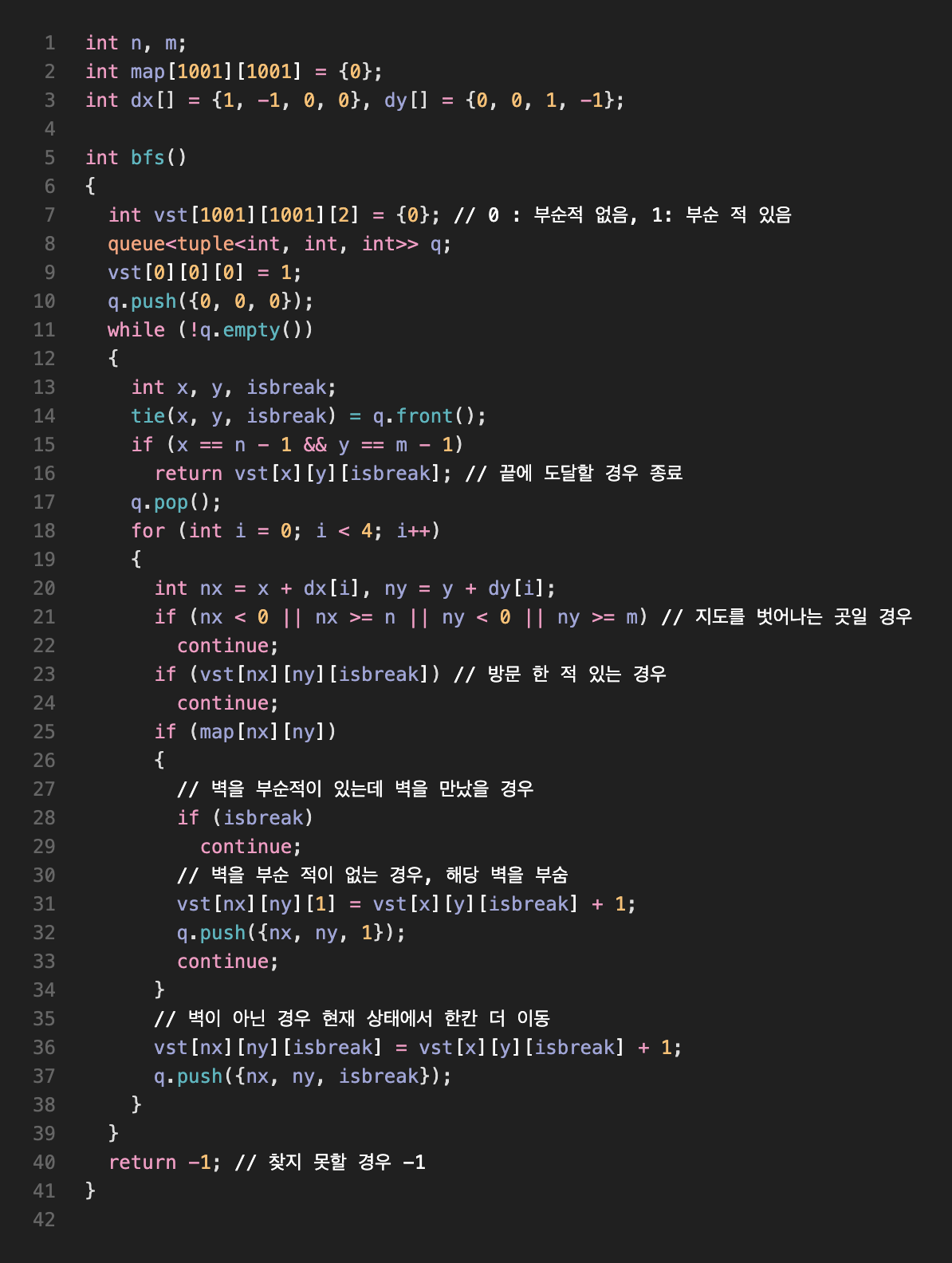 visited 배열과 큐에 저장한다.(다음 방문 할 위치의 visited 값) = (현재 위치의 vistied 값) + 1 방식으로 최단 거리를 탐색한다.visited 를 2개(부수기 전, 부순 후)로 둔다.visited 배열로 넘어가 최단거리를 찾는다.visited[next_x][next_y][breaked] = vistied[x][y][not_breaked] + 1visited[next_x][next_y][not_breaked] = vistied[x][y][not_breaked] + 1visited 배열을 바탕으로 최단거리를 찾는다.visited[next_x][next_y][break_state] = vistied[x][y][break_state] + 1