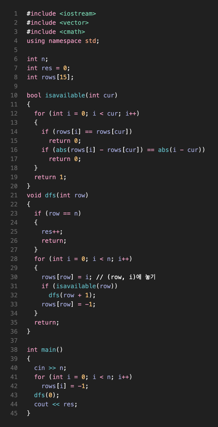 rows[n] 배열 활용) 같은 행에서 2개 이상의 퀸이 존재할 경우의 수는 고려하지 않아도 해결된다.rows[before] - rows[current] == 0 (즉, 두 값이 같은 경우)rows[before]는 n번째 열에 위치하고, rows[current]는 n번째 열에 위치한다.abs(rows[before] - rows[current]) == abs(before - current)rows[0]은 1번째 열에 위치하고, rows[2]는 3번째 열에 위치한다.abs(1-3) == abs(0-2) -> 2==2위 2가지 조건 중 하나라도 부합하는 before가 한 개라도 존재한다면 current 위치에 퀸을 놓는 것이 불가능하다.