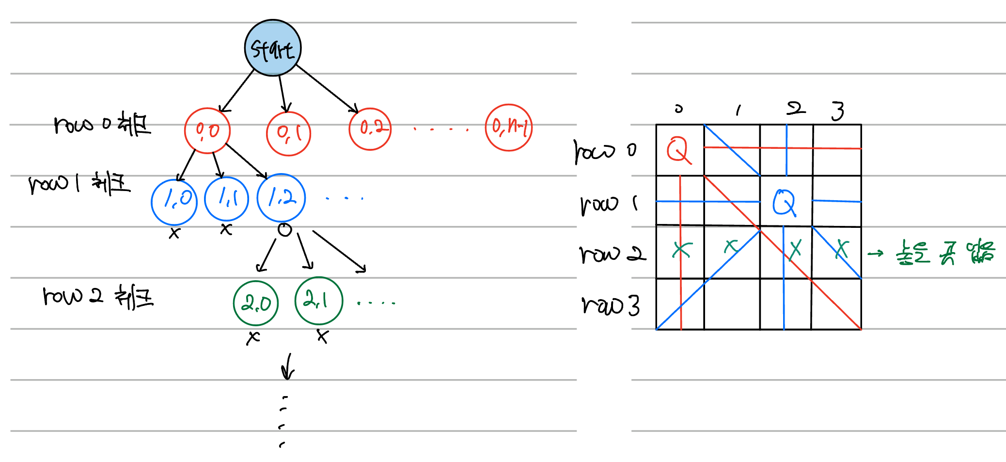 한 행씩 체크해 가며 놓을 수 있는 곳을 확인하고 해당 n번째 행의 m번째 열 (n,m)에 놓을 수 있다면 가지를 뻗어 다음 행을 체크하는 방식이다.'