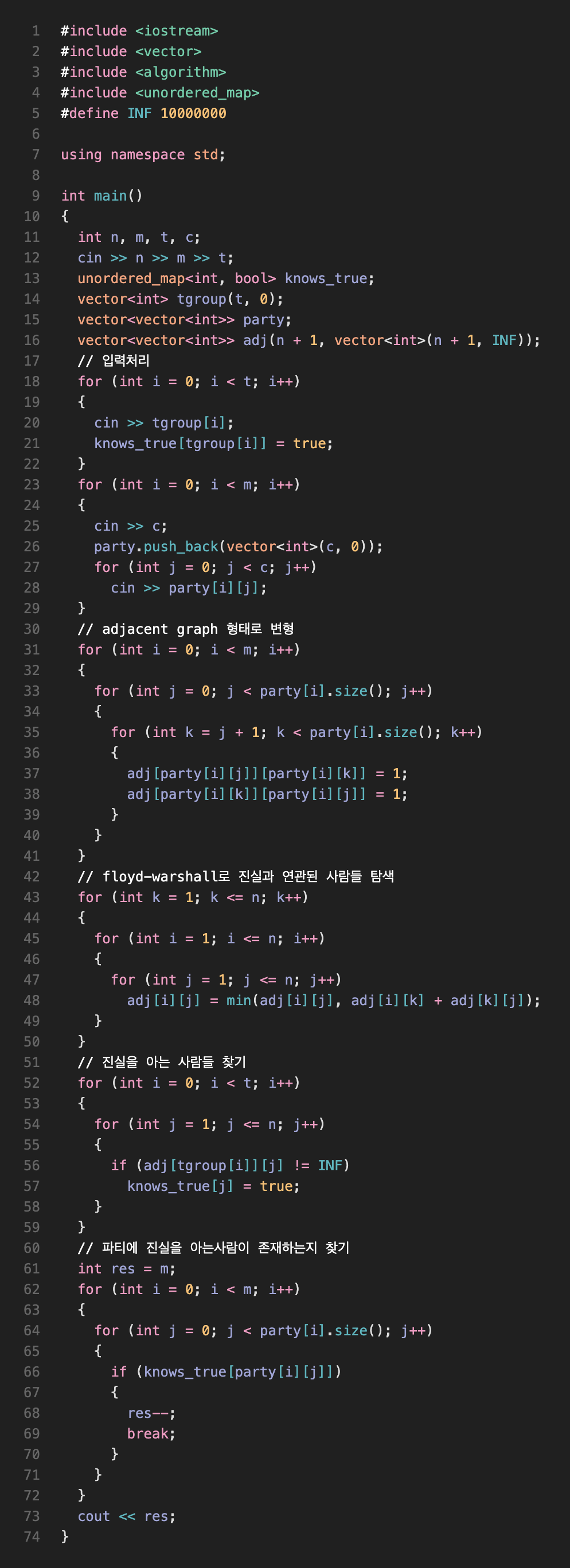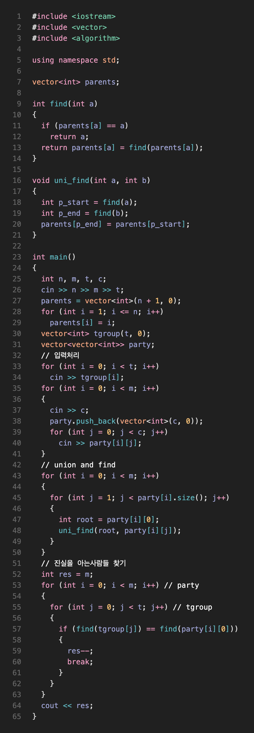 - 모든 파티를 탐색하며 같은 파티에 존재하는 사람들끼리 한 그룹으로 만들어준다.