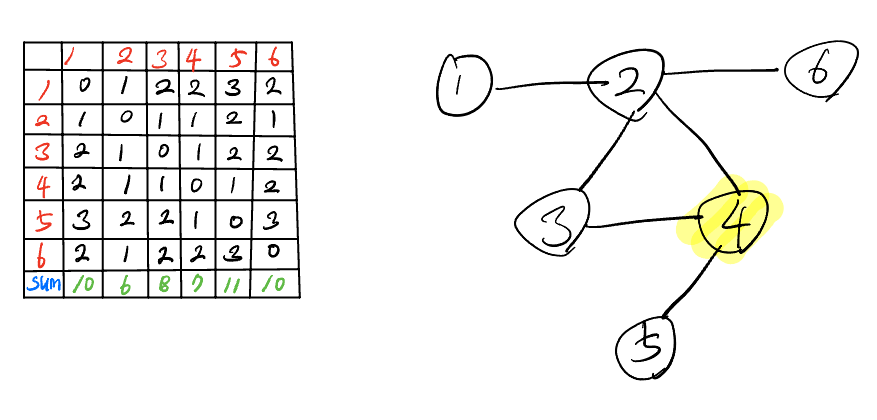 위의 예시를 살펴보면 노드와 노드간의 모든 최단거리를 구하고 이에 대한 합이 가장 적은 노드를 순서대로 중심성이 높다라고 판단할 수 있다.