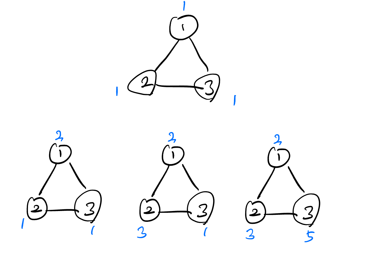 예를 들어 1,2,3번 노드가 삼각형의 형태로 서로 연결되어있다고 생각하자. 그리고 초기의 가중치는 모두 1이다.