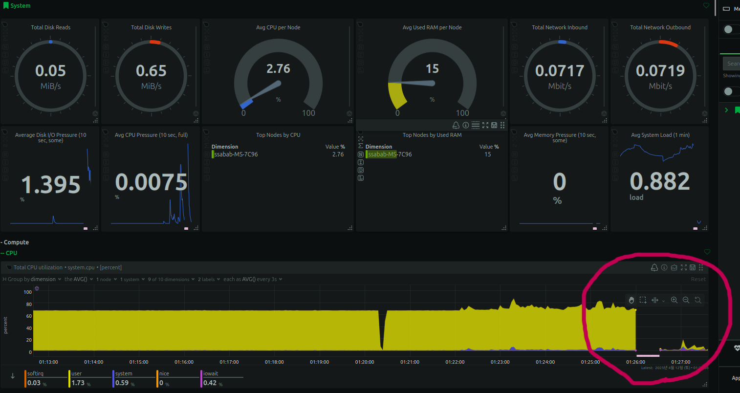 앞서 아무런 사용자가 없어도 66~80%까지 오가던 cpu 사용량이 10% 미만으로 확 줄어버렸습니다.(2025.04.11)