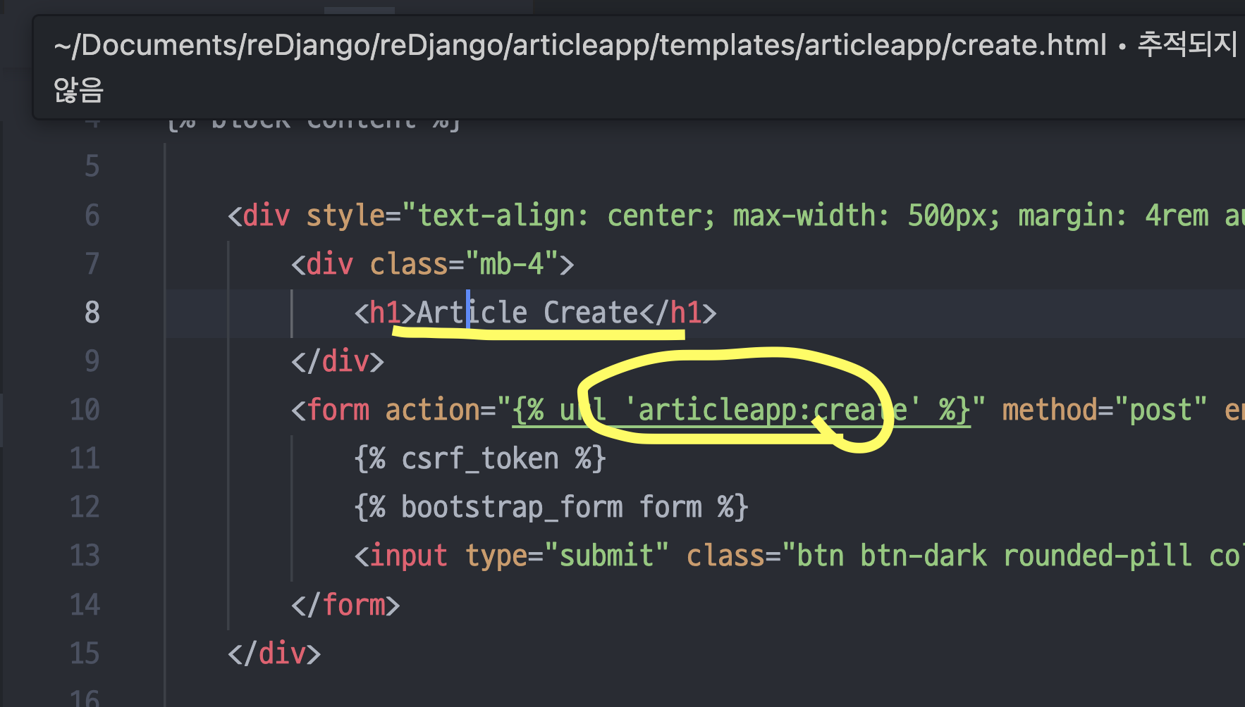 위의 profileapp에서 사용한 create.html과 거의 유사하다. 노란부분만 바뀜.