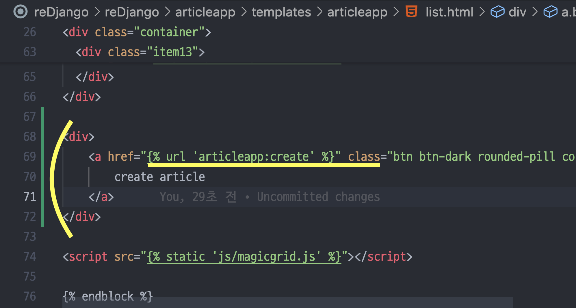 <a href="{% url 'articleapp:create' %}" class="btn btn-dark rounded-pill col-3 mt-3 mb-3">
