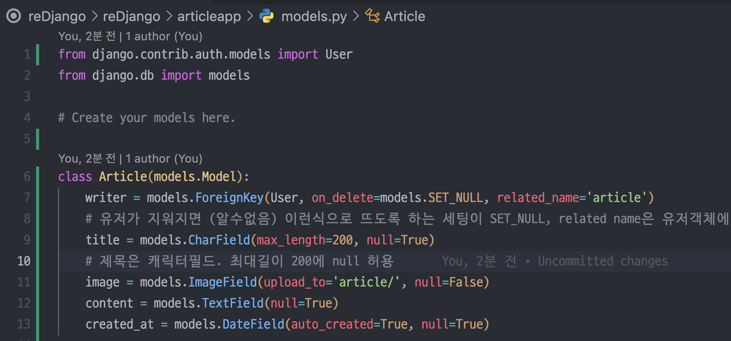 # 유저가 지워지면 (알수없음) 이런식으로 뜨도록 하는 세팅이 SET_NULL, related name은 유저객체에서 접근하기 쉬우라고