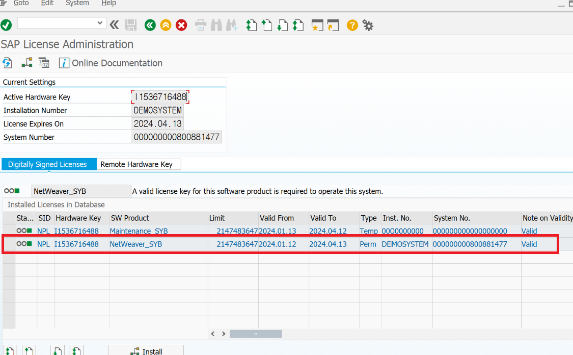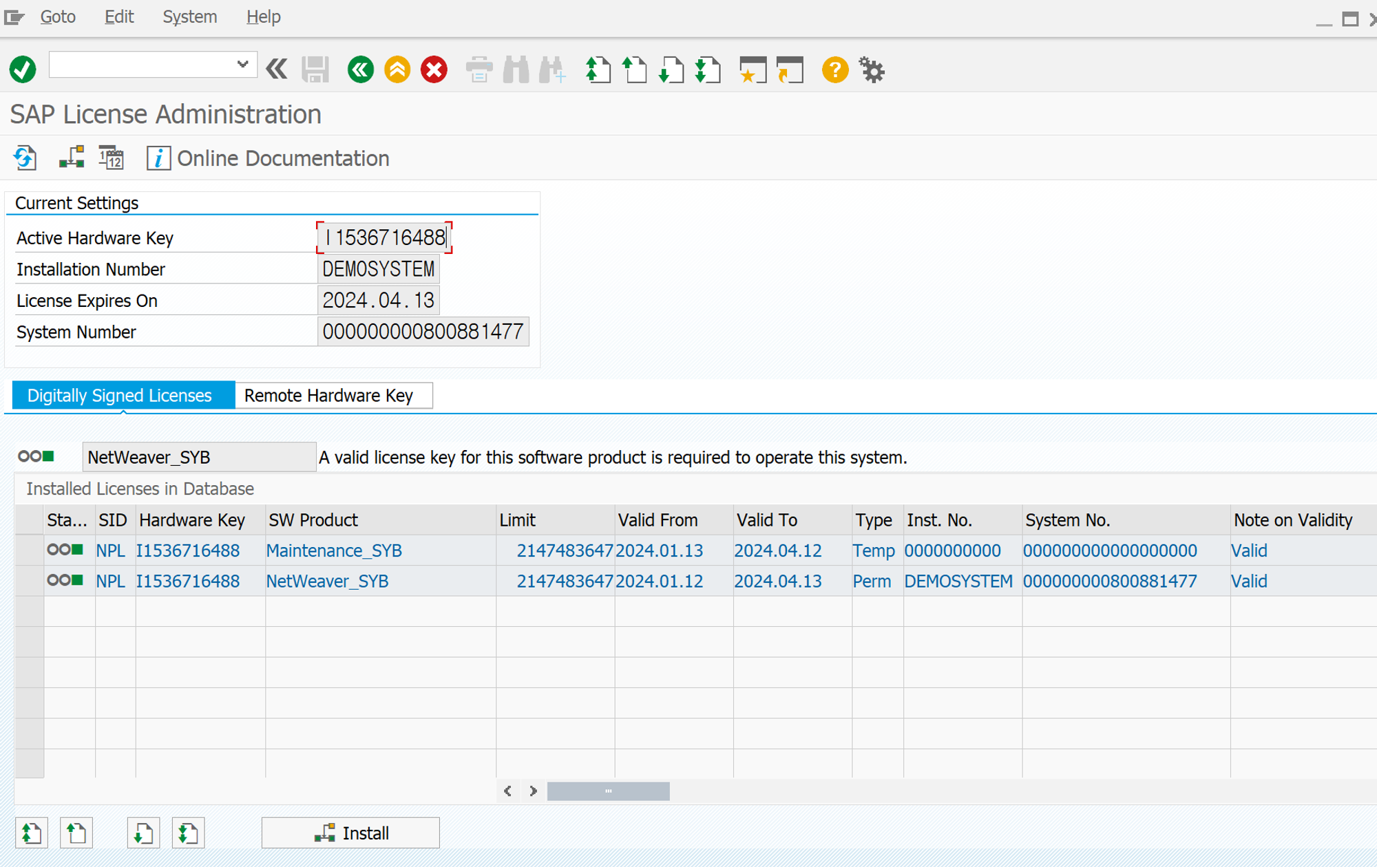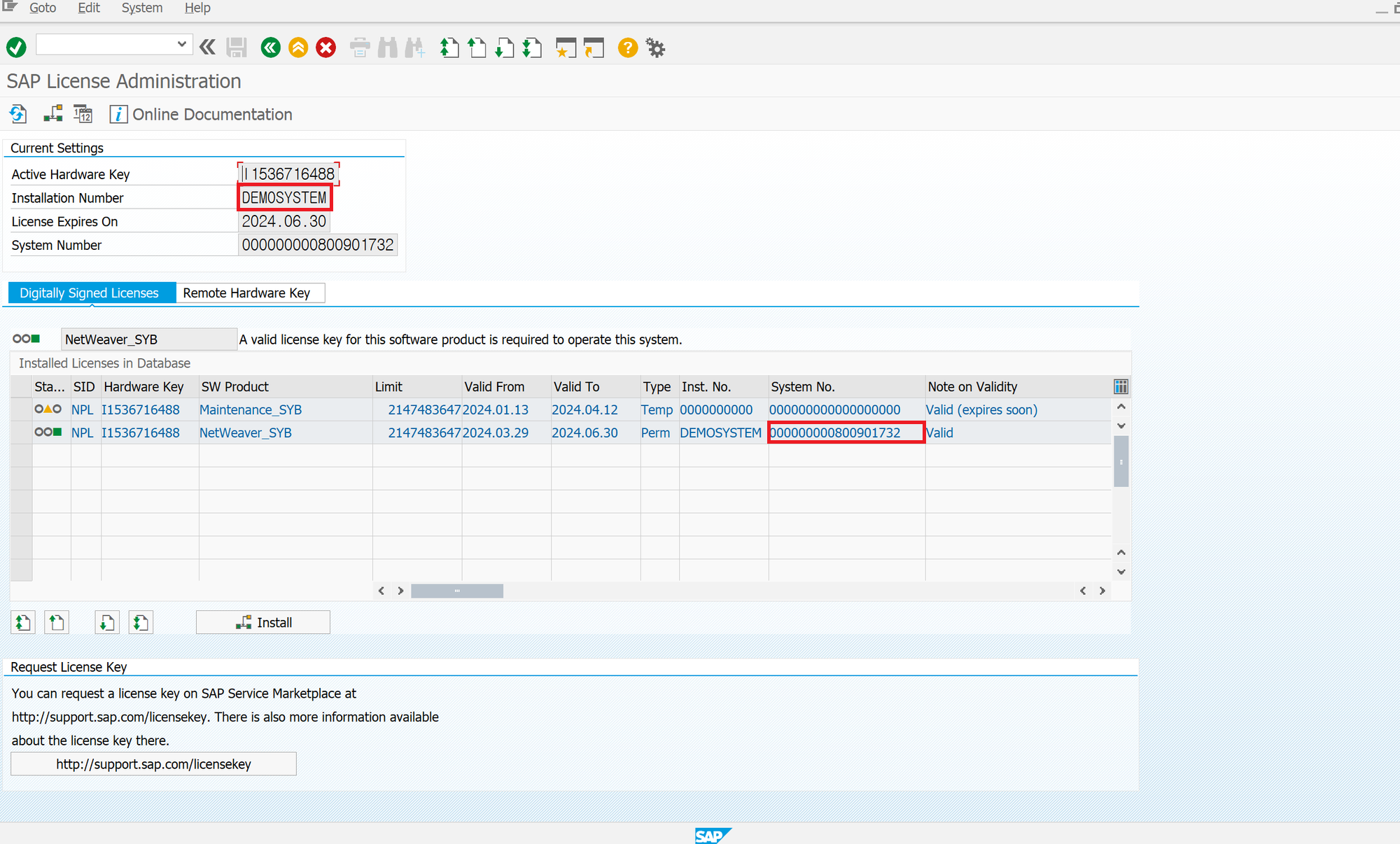 Installation Number 가 DEMOSYSTEM 으로 바뀌고 → System Number 들어간 것을 확인