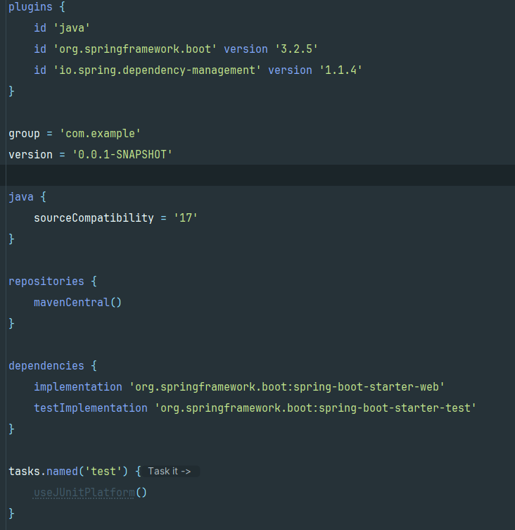 The jar block specifies how the JAR file will be named. In this case, it will render gs-gradle-0.1.0.jar.