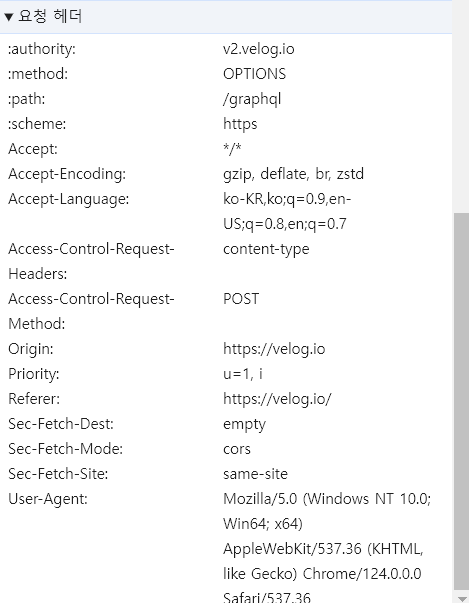 Origin은 서버로 Post 요청을 보낼 때 요청이 어느 주소에 시작되었는지 나타내는 값으로 요청이 https://velog.io 주소에서 요청이 시작되었다는 것을 알 수 있다. 그리고 임시 저장 요청을 했을 때, CORS 에러가 발생하지 않았으므로 요청을 받는 주소 역시 https://velog.io라는 것을 알 수 있다.