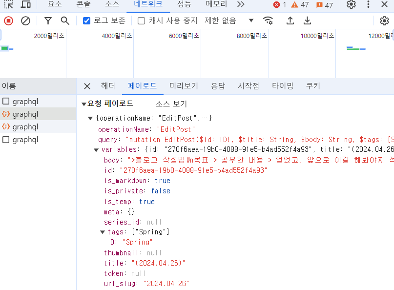현재 Velog를 작성하는 페이지에서 개발자도구 - 네트워크 페이지에서
