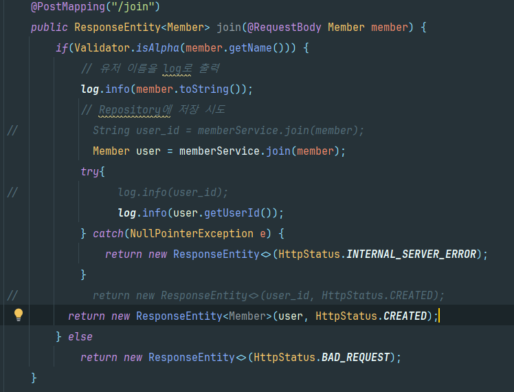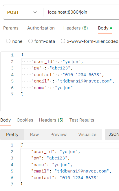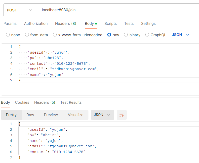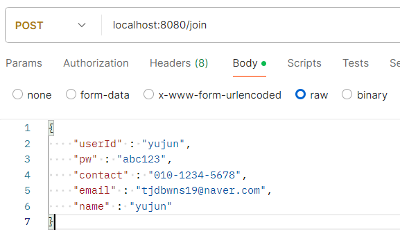 localhost:8080/join 요청으로 위 RequestBody 데이터를 스프링에서 요청받는 Controller를 작성한다.
