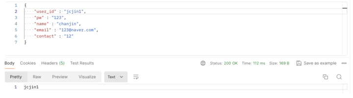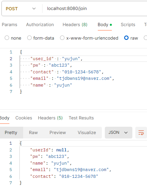 회원가입 로직이 이루어진 이후에, DTO의 userId 필드명이 user_id로 변경 되어 응답이 이루어 진 것을 확인할 수 있었다.