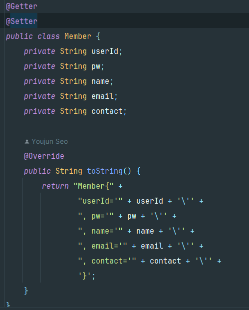 추가한 부분은 DTO 클래스인 Member 클래스에 해당 어노테이션을 추가하였다.