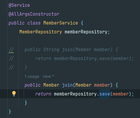 Controller에서 @RequestBody를 Member 타입의 변수로 담고, 이를 저장하는 요청을 Service로 보낸다. 그리고, Service에서는 다음과 같은 코드로 Repository에 요청한다.