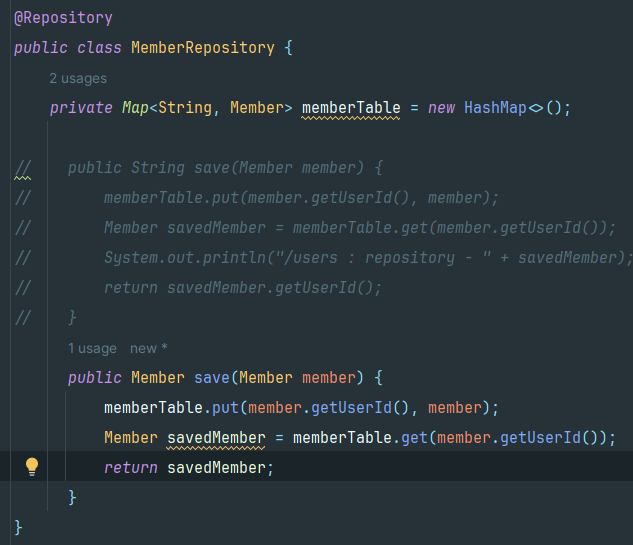 현재 코드에서는 회원가입을 Map에 put으로 저장하고, get을 통해 저장된 Member 객체를 조회하여 반환하도록 구성하였다.