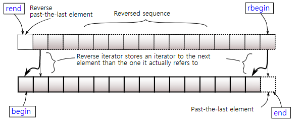 | v.rend() (revers end) | 백터의 (시작 + 1) 지점을 끝 부분으로 반환 |