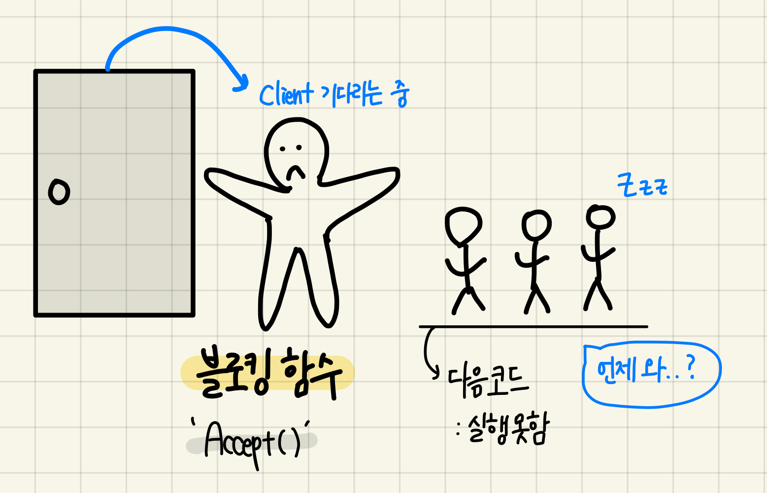 accept()는 문 앞에서 묵묵히 대기 중인 셈이다.