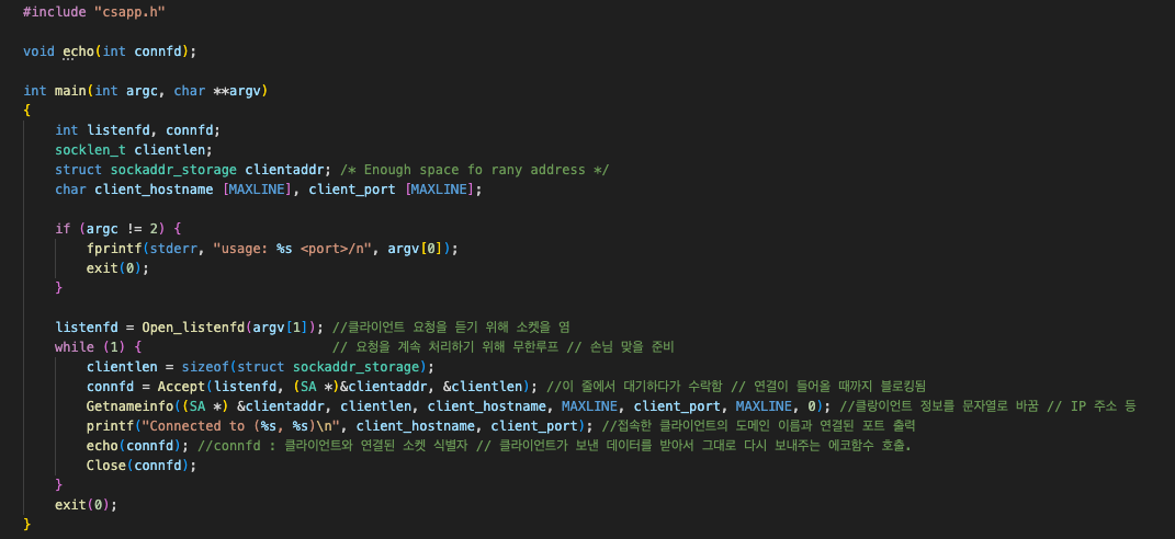 (교재에 있는 echosrveri.는 한 번에 한 개씩의 클라이언트를 반복해서 실행하는 반복서버를 예시로 들고있다.)