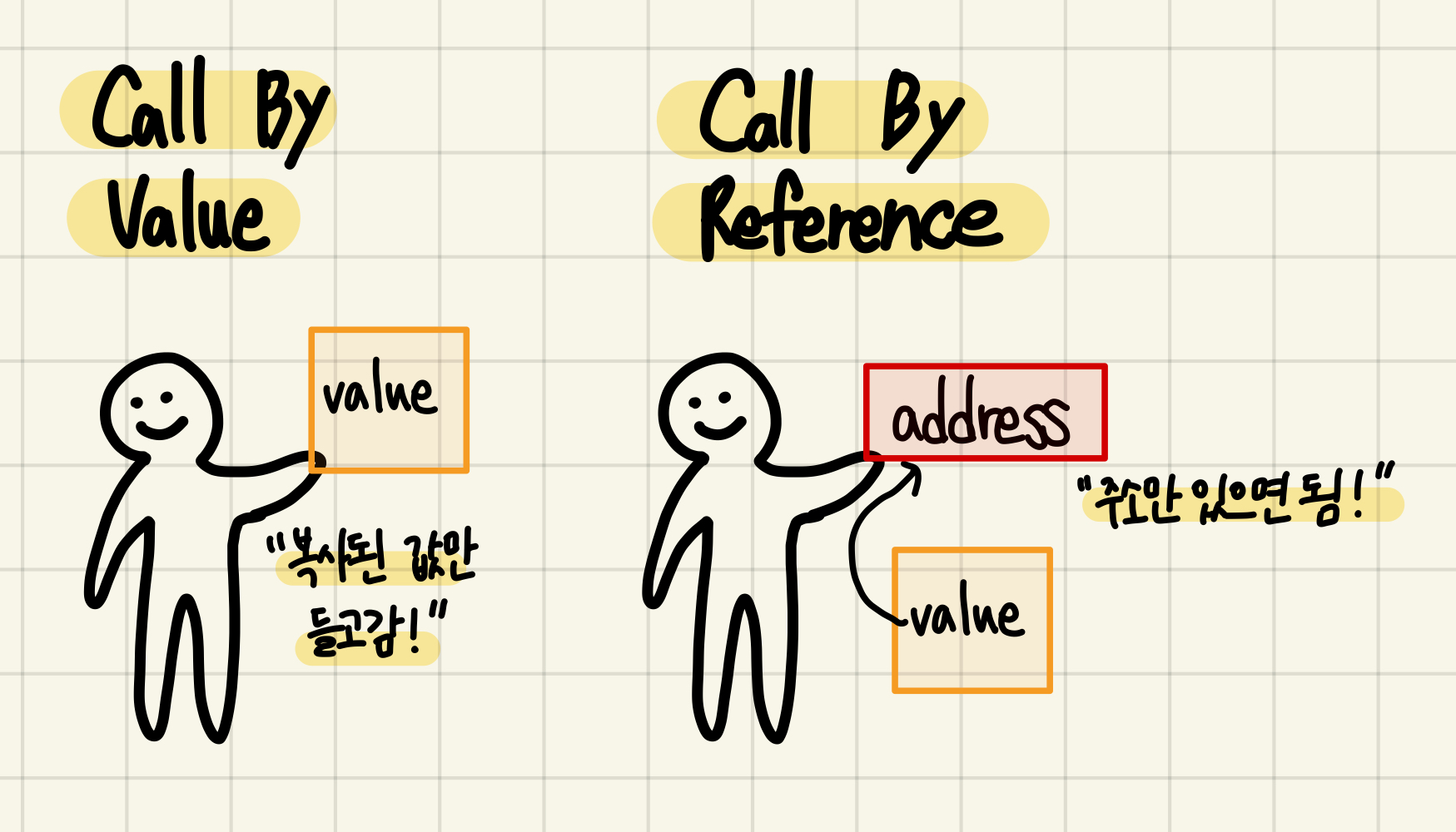 | Call by Value | 값만 복사해서 넘김 | example(int x) | 원본 변경 ❌ |