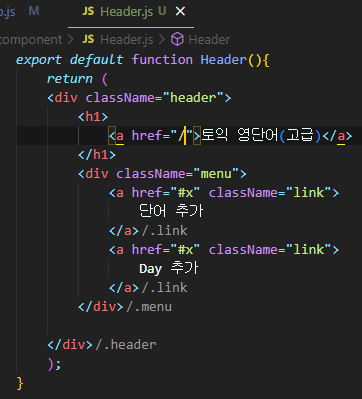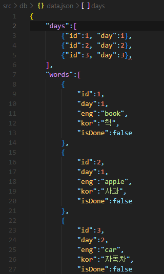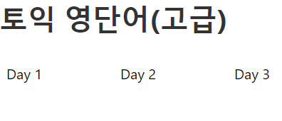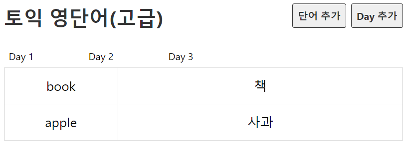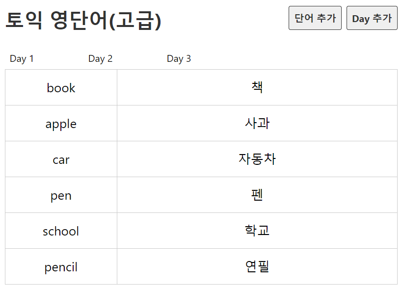 단어가 지금처럼 나오면 안되고, Day 1 등의 데이를 클릭하면 단어가 일차별로 바뀌어야 한다.