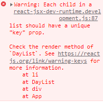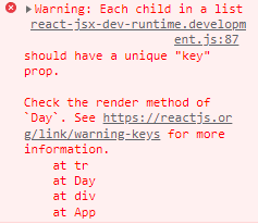 key 는 반복되는 요소의 고유한 값을 넣어줘야 하는데, 여기서는 day.id 를 넣어보자. → 경고문이 사라짐.