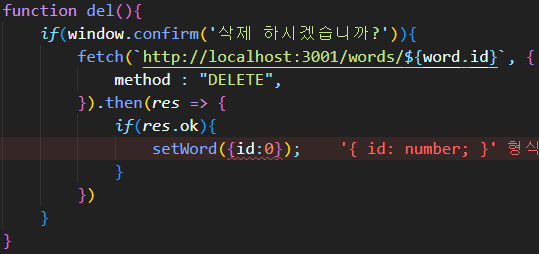 삭제 구현 함수에서 삭제가 성공적으로 되었다면, 그 word 의 id 를 0 으로 바꿔주는 부분이다.
