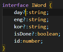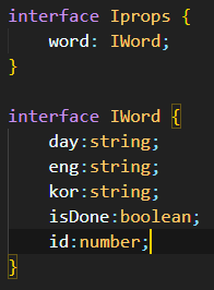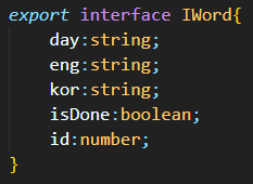 Word.tsx 에 만들어놓은 인터페이스 IWord 에 export 를 붙인다. export 하면 다른 파일에서도 IWord 인터페이스를 사용할 수 있다.