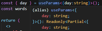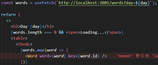 Day.tsx 에 words 에 IWord[] 를 지정해주면 하단의 word.id 에 있는 에러가 사라졌음을 알 수 있다.