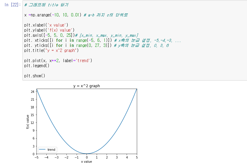 plot(x, x**2) => 의 함수label, axis, xticks, title, legned 등을 배움