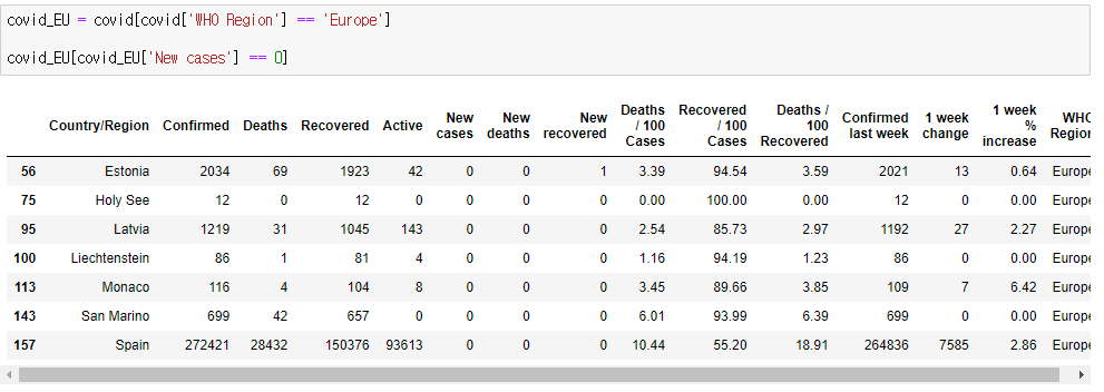 2. covid 데이터에서 신규 확진자가 없는 나라 중 WHO Region 이 'Europe' 를 모두 출력하면?