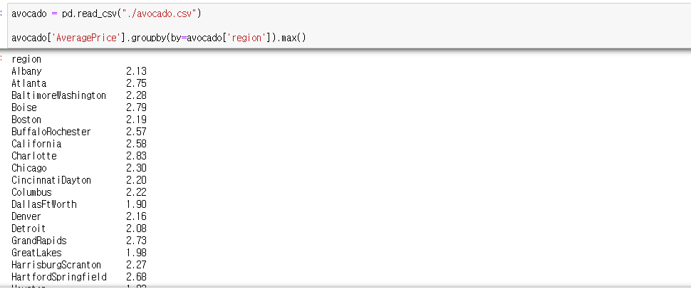3. 다음 데이터를 이용해 각 Region별로 아보카도가 가장 비싼 평균가격(AveragePrice) 를 출력하면?
