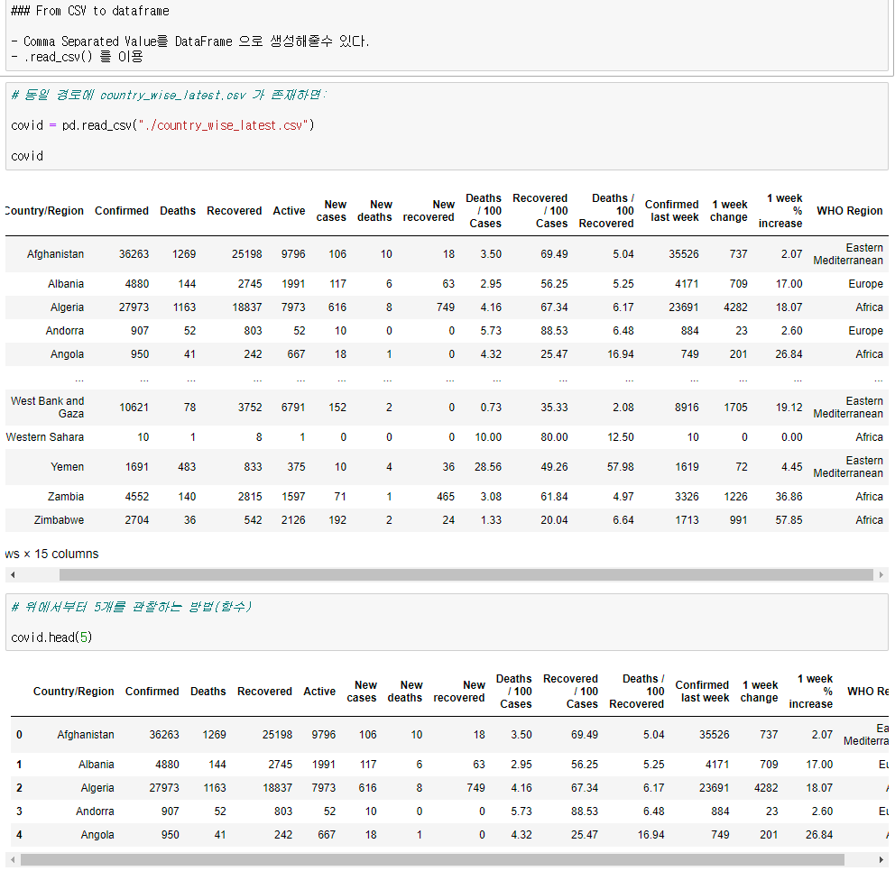 2강에서 는 실제 캐글에 있는 Covid-19 csv 데이터를 가져와서 다뤄봤다.