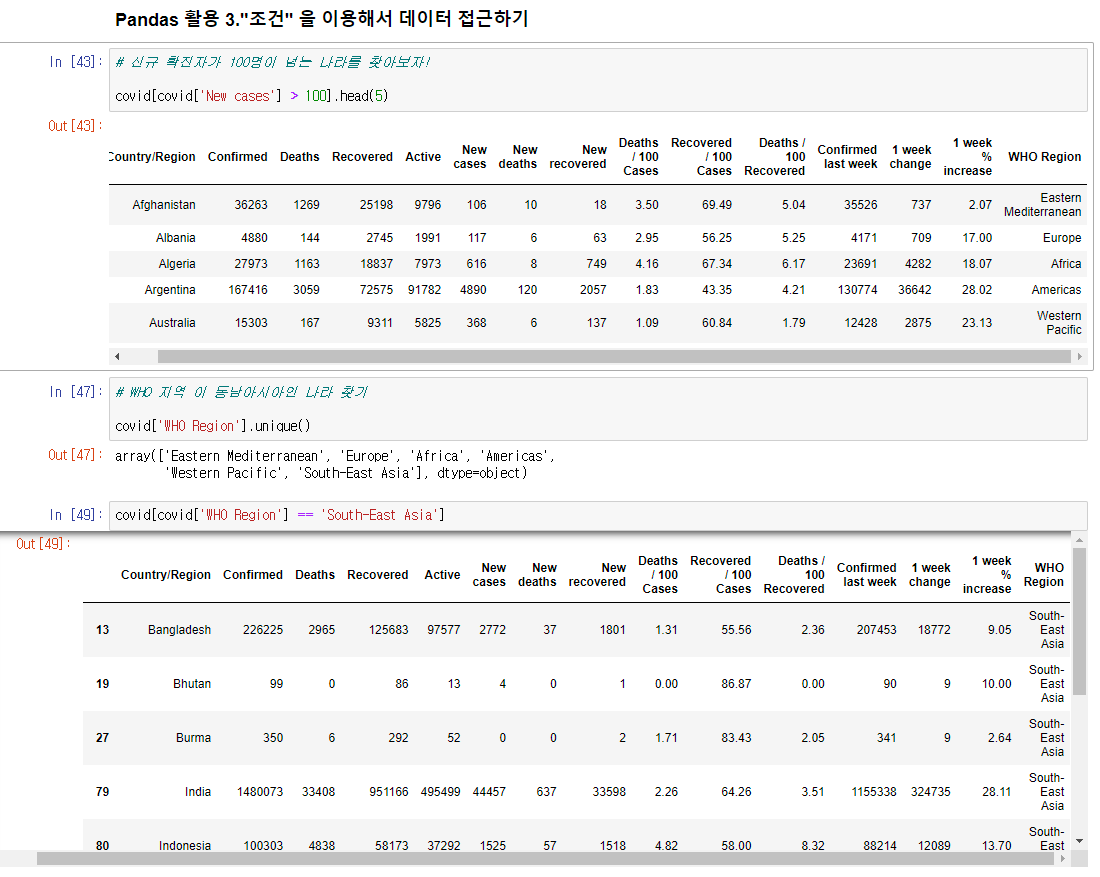 covid[covid['New case'] > 100].head(5) 를 통해서코비드의 New case가 100보다 큰 값들의 위에서부터 5개의 데이터를 읽을수 있다.(covid['New case']>100 을 사용하면 False True 의 데이터로만 읽어옴)