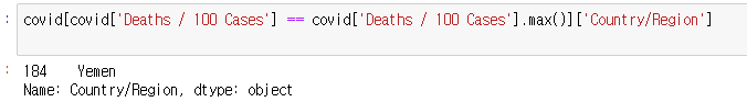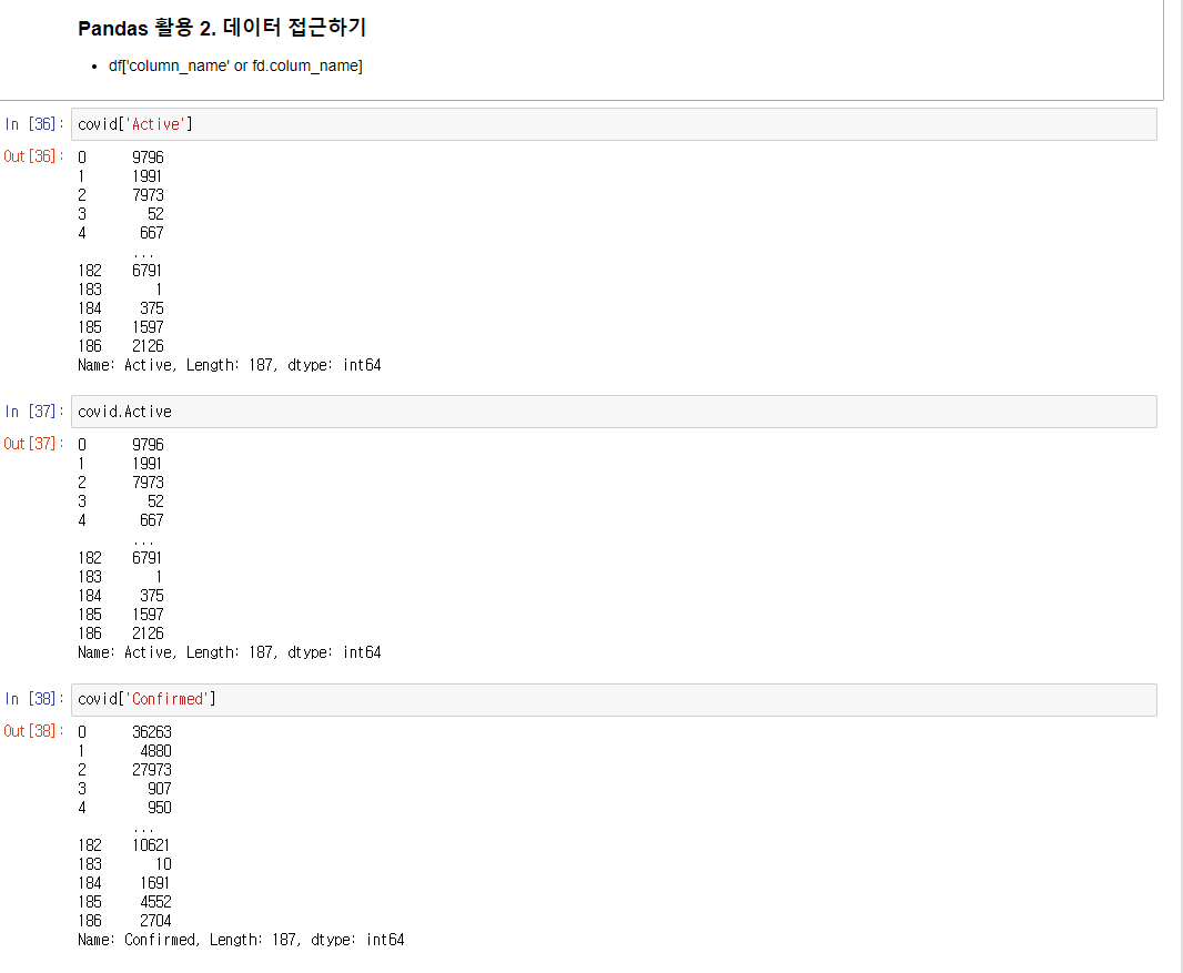 covid['Confirmed'][1:5] 를 통해서 코비드의 confirmed 열의 1~4 까지의 데이터를 읽어올수 있음.