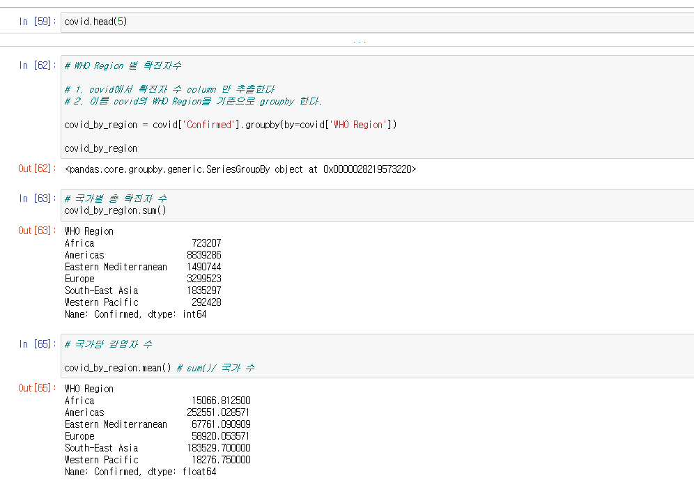 을 통하여 WHO Region 별 확진자 수로 groupbycovid_by_region.sum() 을 통하여 groupby 한 결과의 총합을 구함
