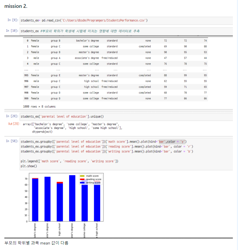 부모의 학위가 학생에 시험에 미치는 영향에 대한 데이터 에서 부모의 학위별 과목의 mean 이 다르다는 점을 찾았다. 다만 그래프화 에 있어서 각 데이터별 bar그래프를 하려고 했으나 조금 잘못된 그래프를 그렸다. 해당 문제 해결요청 해둔 상태