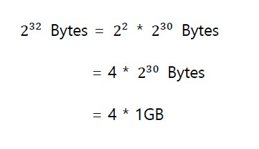 최대 사용할 수 있는 메모리 양은 4GB입니다. 레지스터가 한 번에 표현가능한 값의 크기(4,294,967,296) 는 CPU가 한 번에 인식하여 처리할 수 있는 주소 값의 범위가 됩니다. 다시 말해, 32bit 컴퓨터의 레지스터는 2의 32승개(4,294,967,296)의 주소 공간을 사용할 수 있습니다.