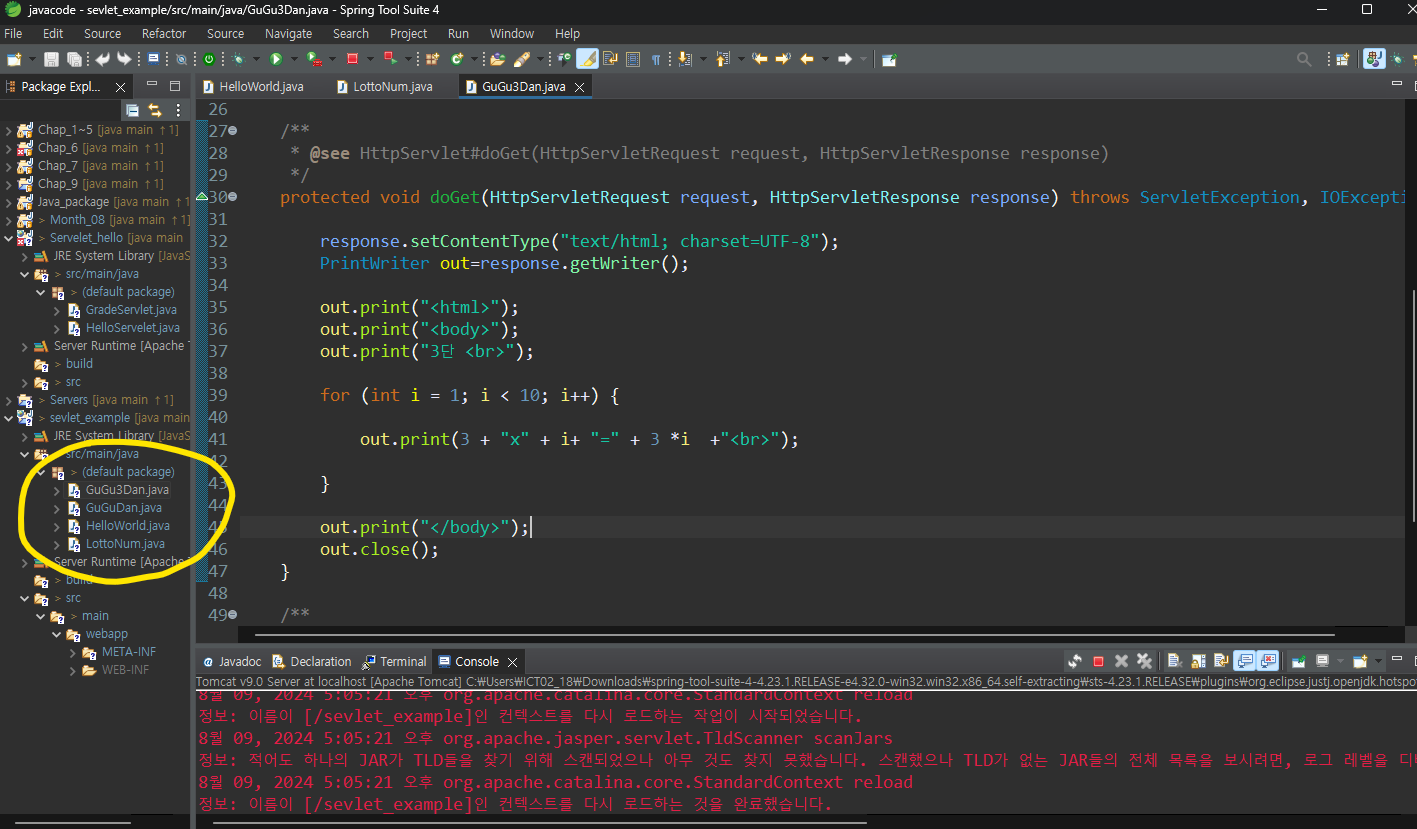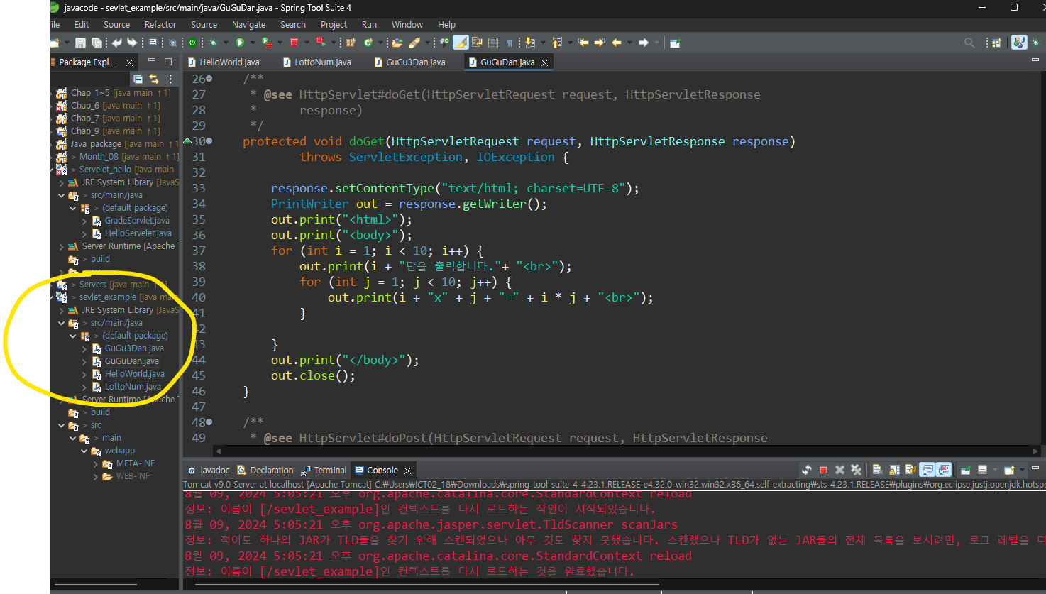 -/gugudan 으로 치고 들어오면 구구단(1단~9단)을 출력하는 GuGuDan.java 서블릿 파일 작성