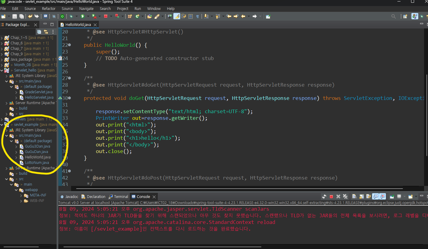 -/hello 로 치고 들어오면 Hello 를 출력하는 HelloWorld.java 서블릿 파일 작성