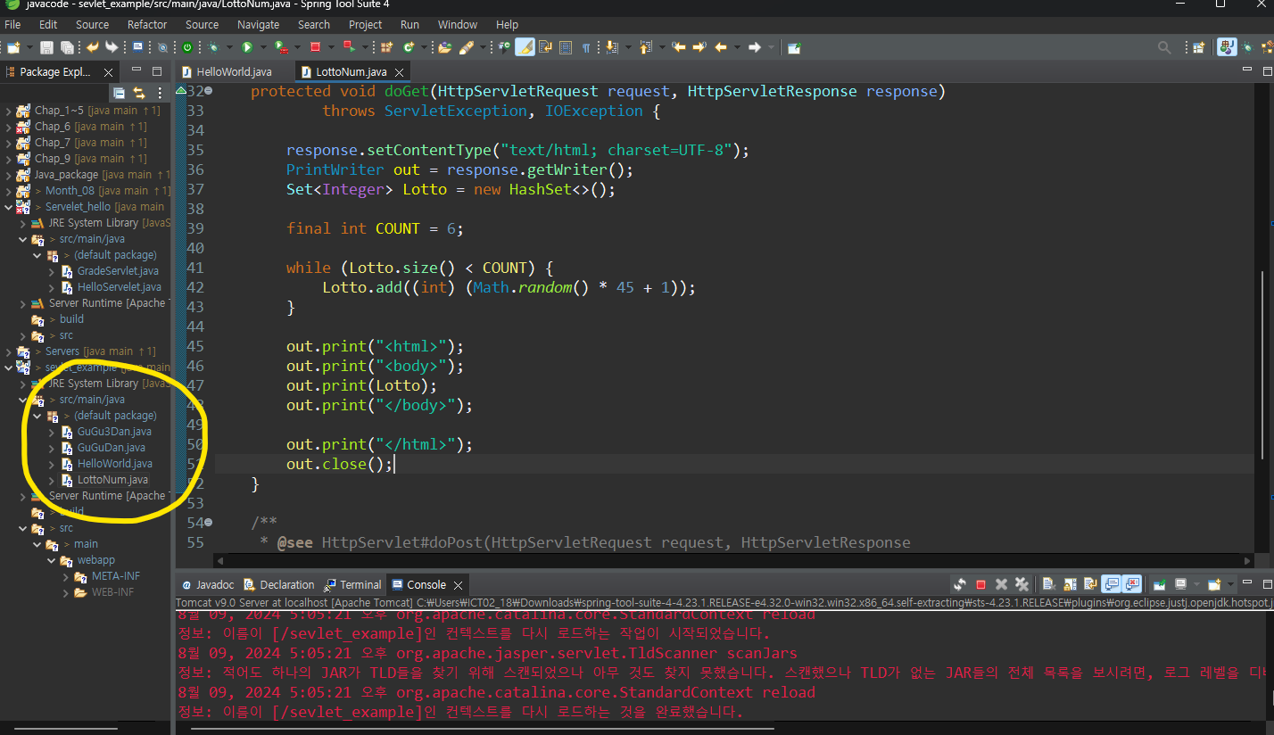 -/lotto 로 치고 들어오면 로또번호 6개를 출력하는 LottoNum.java 서블릿 파일 작성