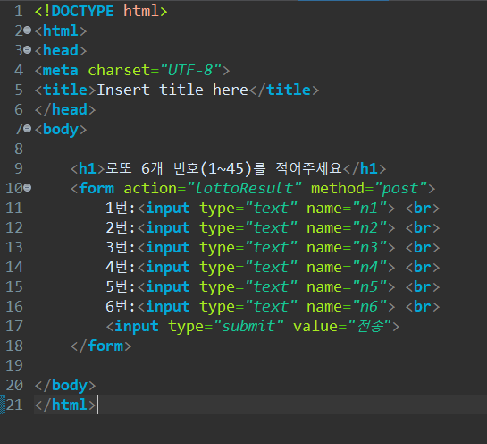 lotto.html 에서 6개의 번호및 전송 버튼을 만든다.