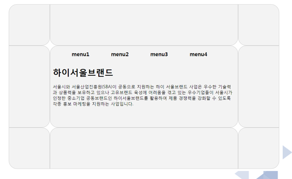 Document#content .center ul li{ list-style: none; float: left; padding: 0 40px; font-weight: bold; font-size: 20px; } #content .hiseoul{ clear: both; padding: 10px; } </style>123<div id="content"> <div class="left">4</div> <div class="center"> <div> <ul> <li>menu1</li> <li>menu2</li> <li>menu3</li> <li>menu4</li> </ul> </div> <div class="hiseoul"> <h1>하이서울브랜드</h1> <p>서울시와 서울산업진흥원(SBA)이 공동으로 지원하는 하이서울브랜드 사업은 우수한 기술력과 상품력을 보유하고 있으나