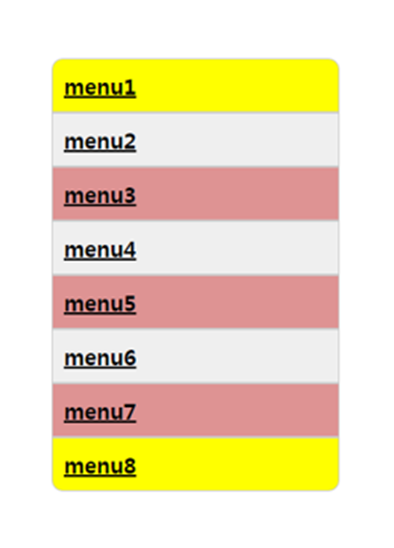 <!DOCTYPE html> <html lang="en"> <head> <meta charset="UTF-8"> <meta name="viewport" content="width=device-width, initial-scale=1.0"> <title>Document</title> <style> #content{ width: 300px; } ul > li { text-align: center; border: 1px solid #cccccc; font-size: 20px; font-weight: bold; background-color: #efefef; list-style: none; padding: 10px; color: black; /* padding-top: 10px; padding-left: 10px; padding-bottom: 10px; padding-right: 10px; */ } ul li:first-child{ border-radius: 10px 10px 0 0; } ul li:last-child{ border-radius: 0 0 10px 10px; } ul li:nth-child(2n+1){ background-color: pink } ul li:nth-child(2n){ background-color: #cccccc } ul li:first-child, ul li:last-child{ background-color: yellow; } </style> </head> <body> <div id="content"> <ul> <li><a href="a">menu1</a></li> <li><a href="a">menu2</a></li> <li><a href="a">menu3</a></li> <li><a href="a">menu4</a></li> <li><a href="a">menu5</a></li> <li><a href="a">menu6</a></li> <li><a href="a">menu7</a></li> <li><a href="a">menu8</a></li> </ul> </div> </body> </html>